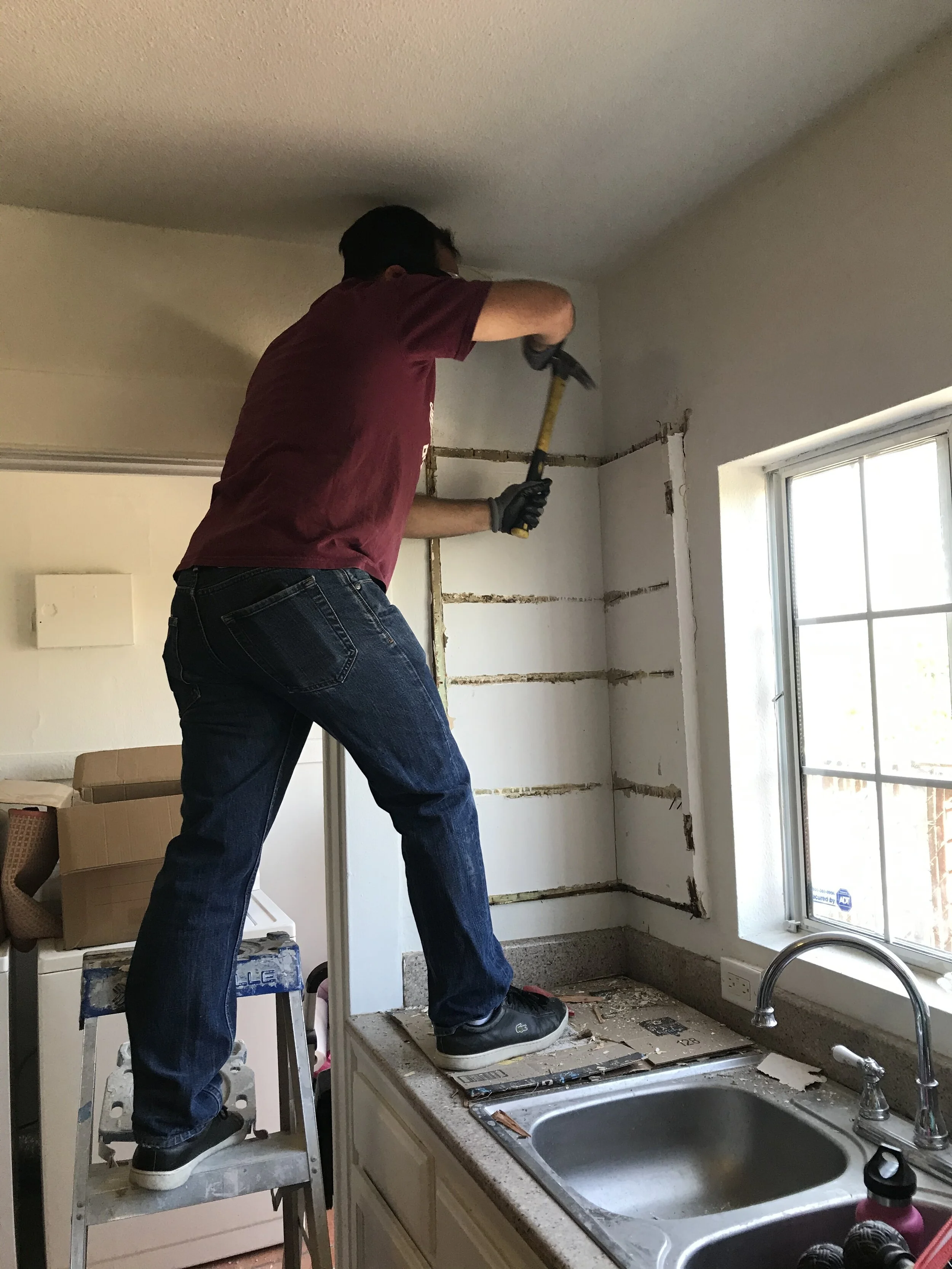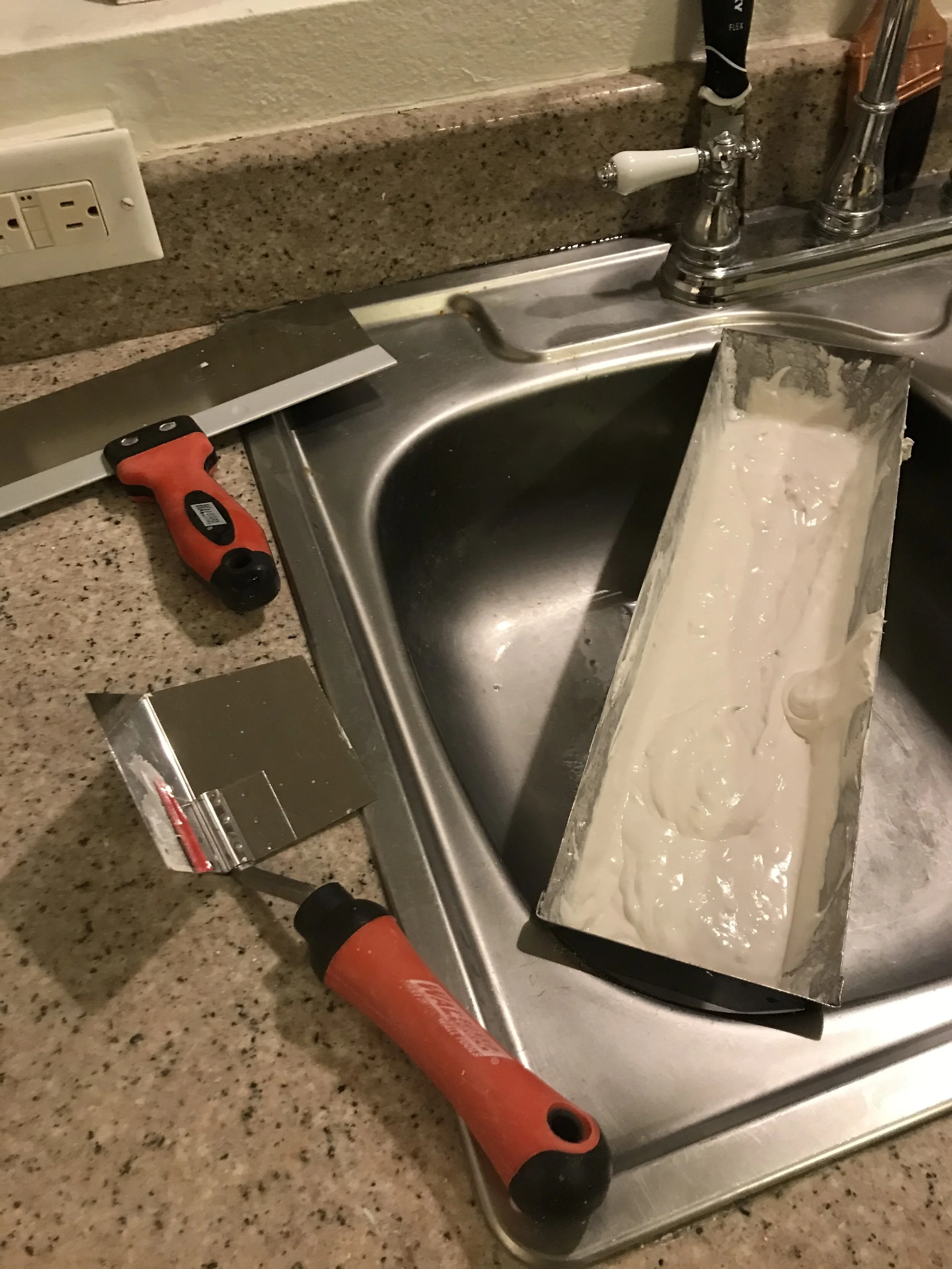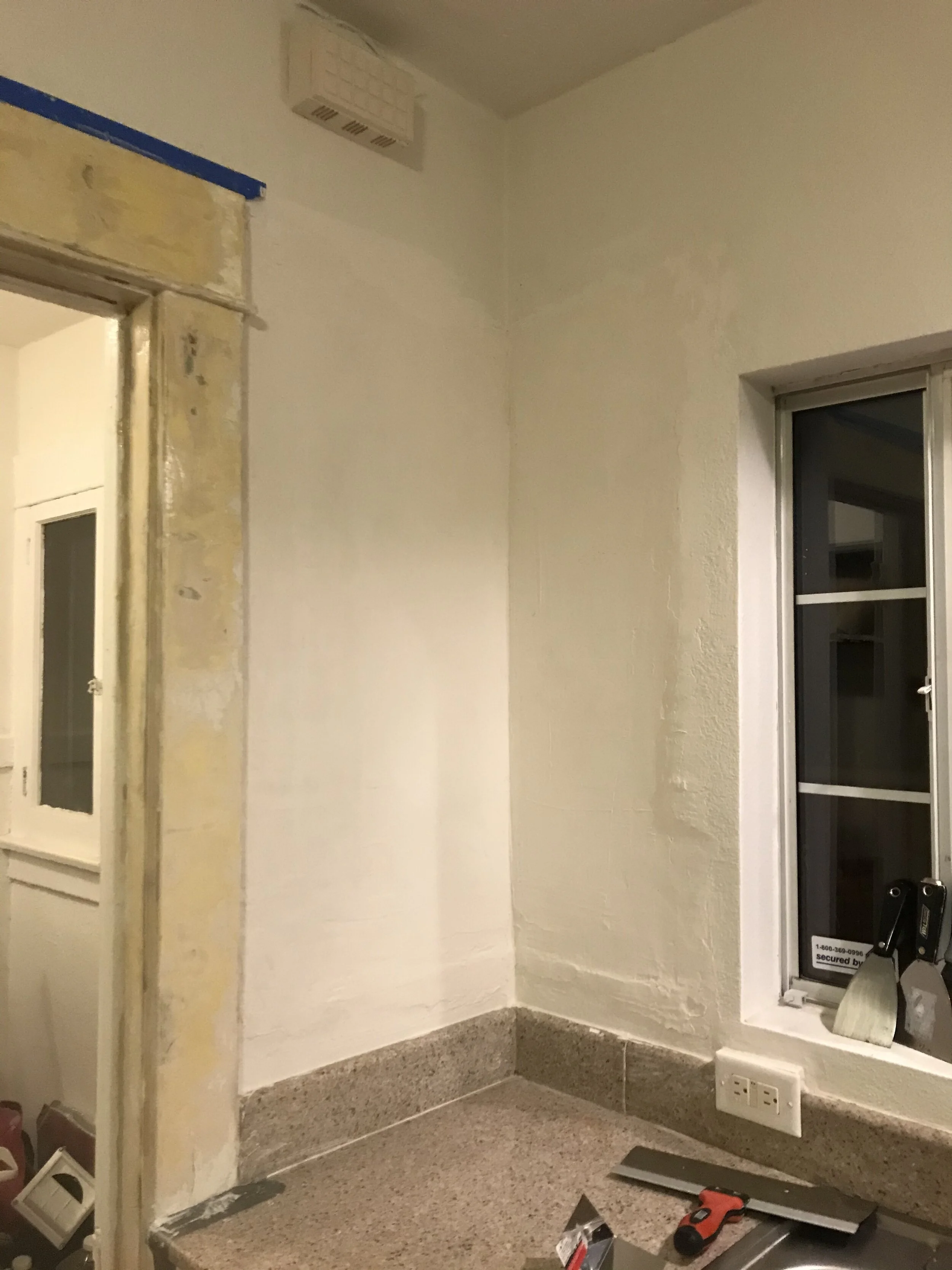 Moshe helped me destroy it. Which led to a gaping 1/4-1/2” indent in the wall. Mike taught me how to mix joint compound and apply it to the wall using his 3 different sized putty/joint knives. He did the first layer and I did the next 3-4. It’s a process that requires some patience… you have to make sure the compound consistency is adequate so it adheres to the wall, but is not too thick that it dries quicker than you can apply it. And any slight deviation in smoothing it leads to ripples. It’s kind of like an OCD nightmare… but I got it done and the corner walls are almost right-angled!